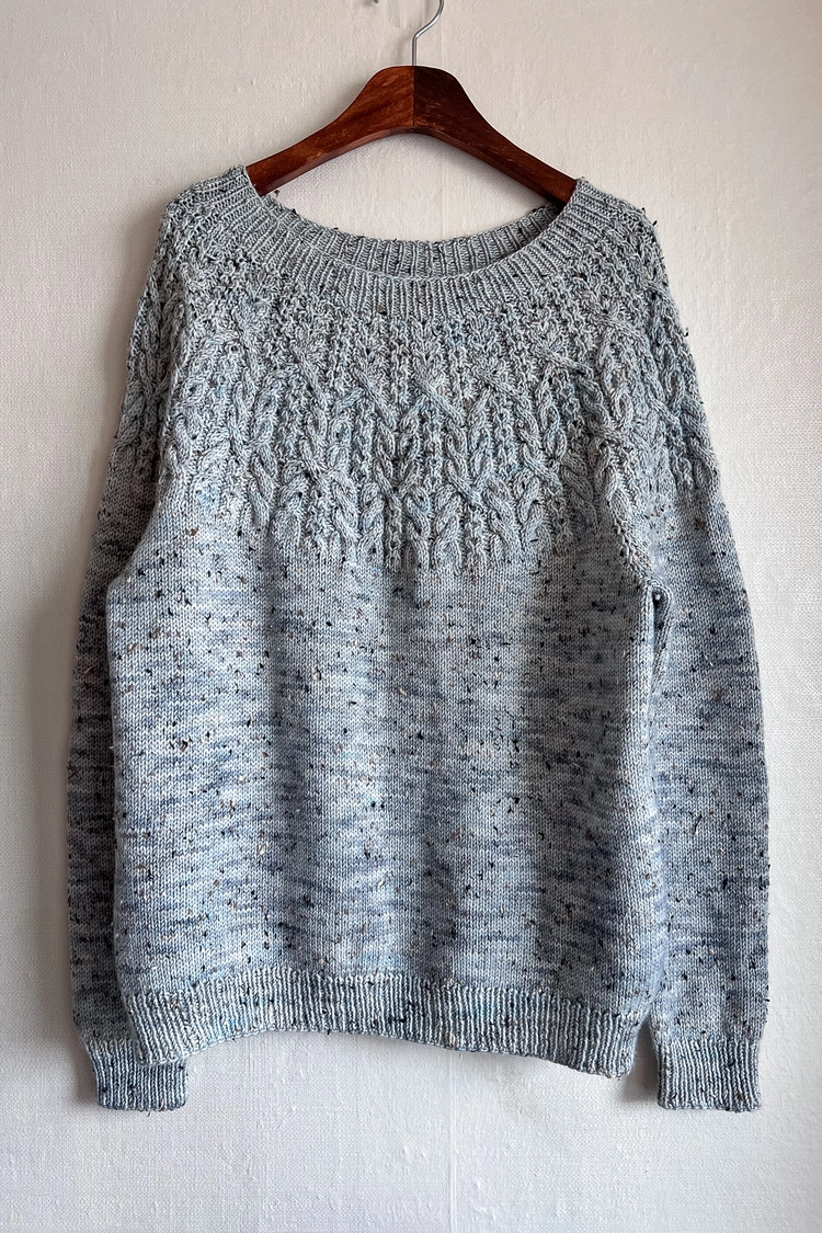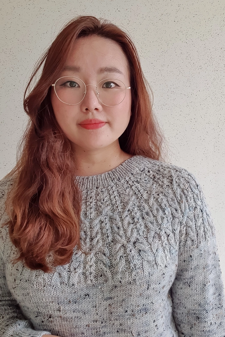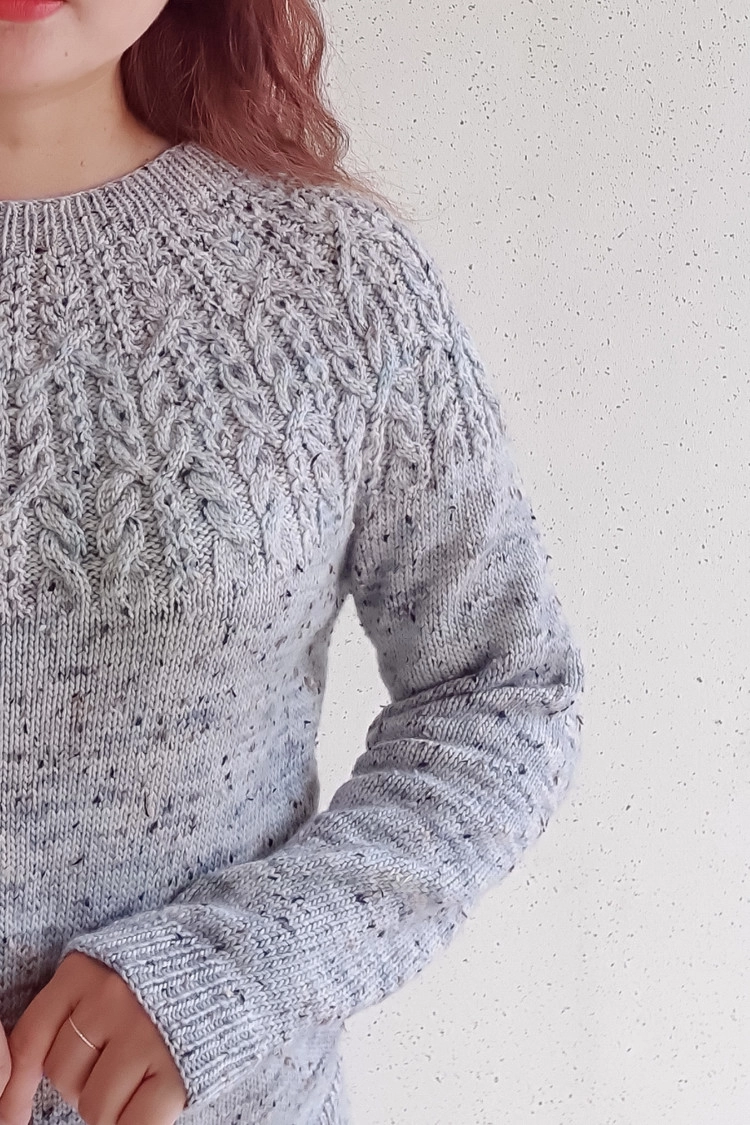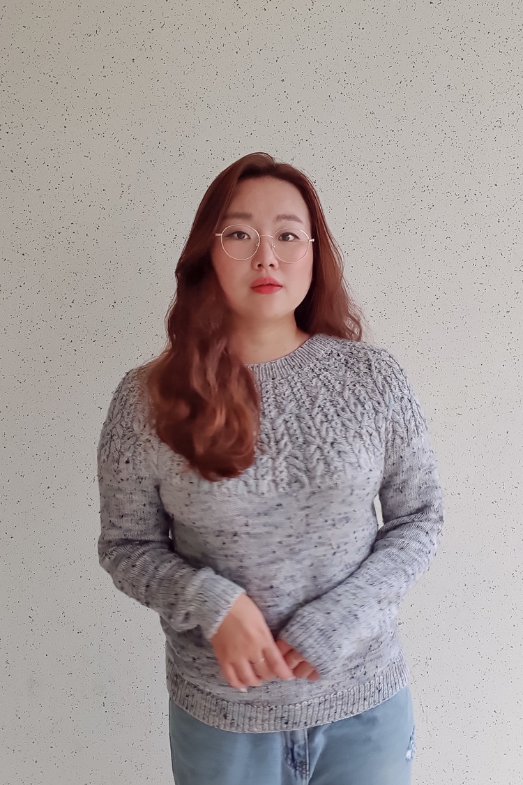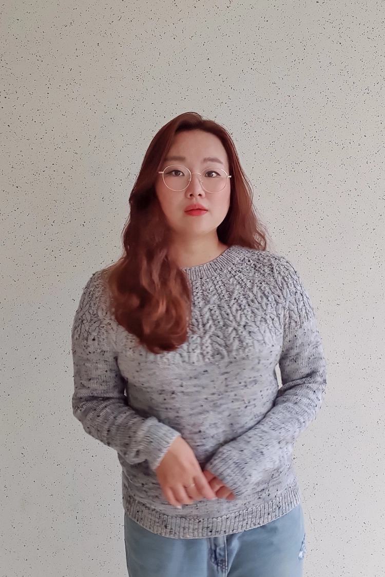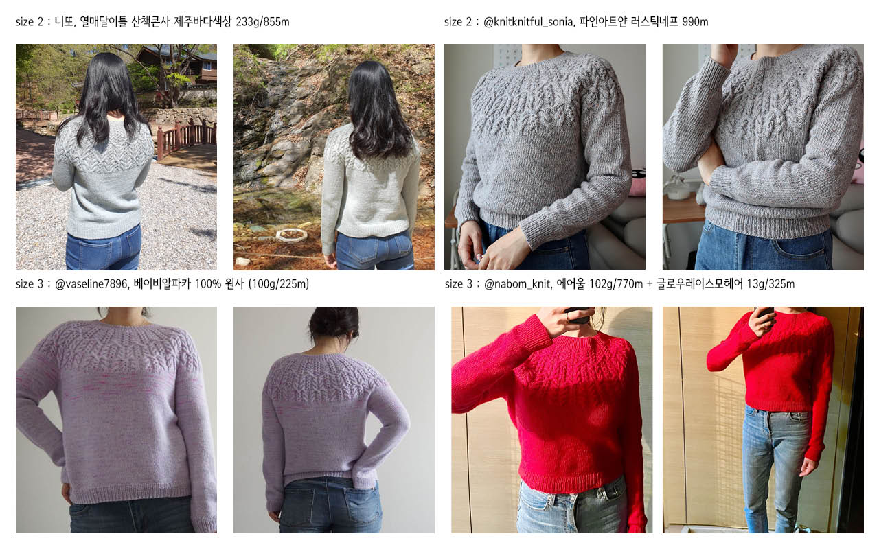 물결이뇽 풀오버는 넥밴드에서 부터 떠서 내려오는 탑다운 요크 스웨터입니다. 폭포에서 영감을 받은 케이블 무늬가 요크 전체에 들어가며, 자연스러운 요크늘림과 도전이 될 수도 있는 케이블 무늬가 매력입니다. 기본적인 탑다운 요크늘림 구조로 넥밴드부터 소매와 몸통을 함께 뜨다가 암홀에서 소매와 몸통을 분리하고, 몸통만 원통으로 떠서 마무리 한 후, 소매코를 주워 또다시 원통으로 떠 마무리하는 구조입니다.
