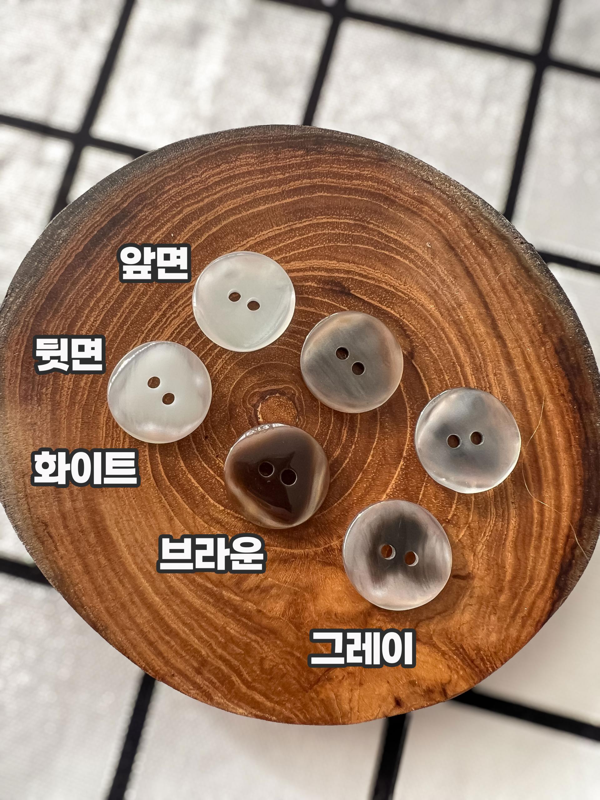 반투명에 자개 느낌으로 반짝이는 질감에 뒷면엔 진한 세모무늬가 들어가는 반전단추에요:)