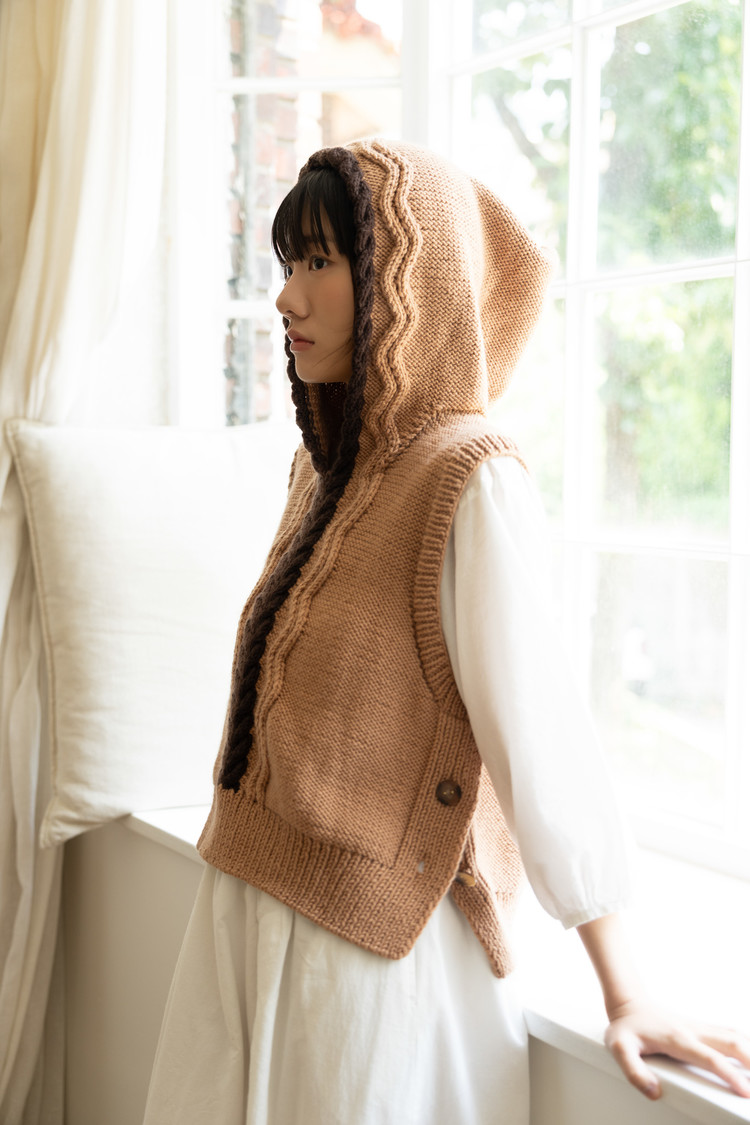 네크라인에서 코를 주워 앞판의 무늬가 연결되도록 후드무늬를 넣고, 옆선은 단추를 달아 자유롭게 코디할 수 있습니다.