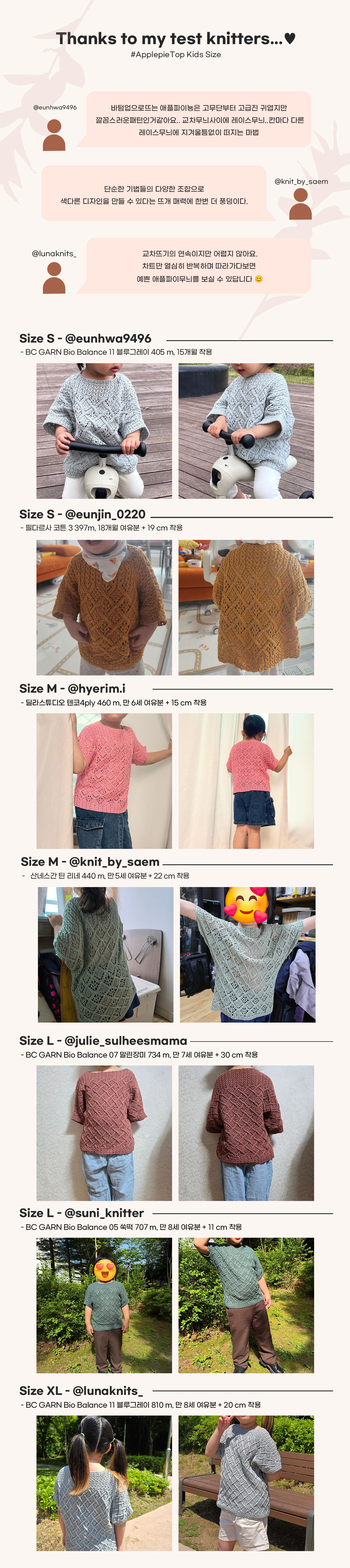 애플파이뇽 탑은 바텀업 방식의 반팔 탑입니다. 원통뜨기로 몸통을 뜬 뒤 암홀 지점에서 앞뒤판을 분리하고 소매를 포함해 각각 떠 준 후 앞뒤판을 연결하는 방식으로 완성됩니다. 애플파이를 닮은 교차무늬와 레이스무늬의 조합으로 입체감을 살렸고, 여유있는 핏으로 편안하고 자연스럽게 착용할 수 있습니다.