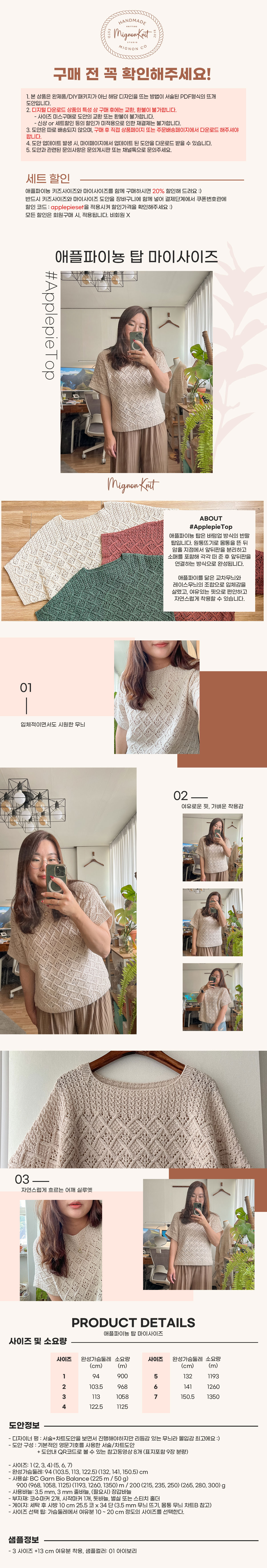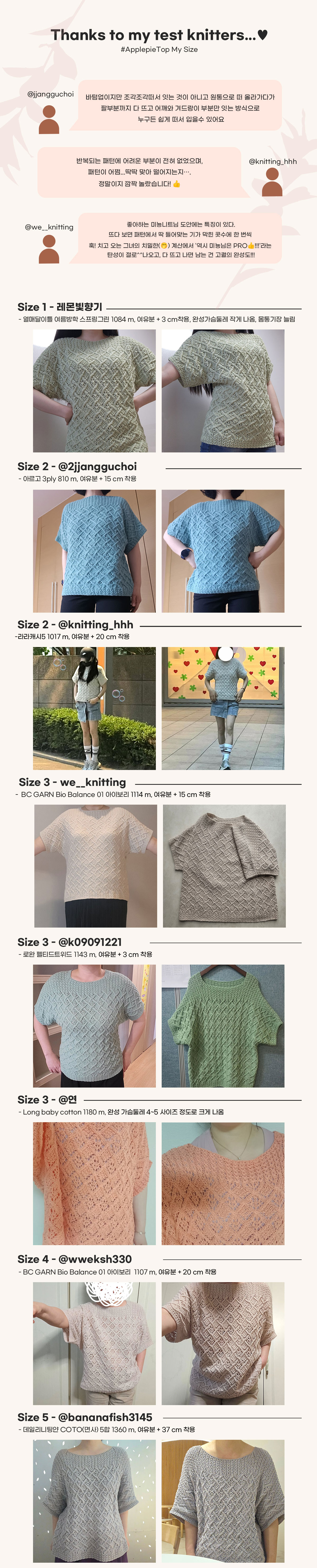 애플파이뇽 탑은 바텀업 방식의 반팔 탑입니다. 원통뜨기로 몸통을 뜬 뒤 암홀 지점에서 앞뒤판을 분리하고 소매를 포함해 각각 떠 준 후 앞뒤판을 연결하는 방식으로 완성됩니다. 애플파이를 닮은 교차무늬와 레이스무늬의 조합으로 입체감을 살렸고, 여유있는 핏으로 편안하고 자연스럽게 착용할 수 있습니다.