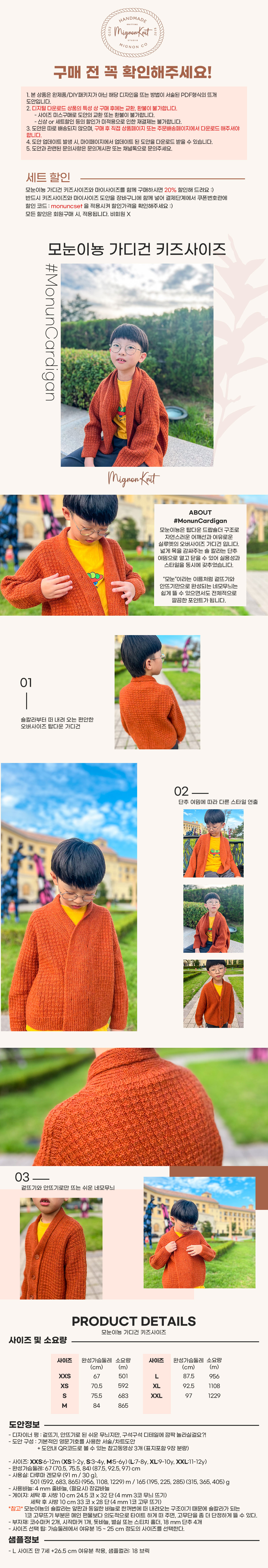 모눈이뇽 가디건은 탑다운 드랍숄더 구조로 자연스러운 어깨선과 여유로운 실루엣이다. 넓게 목을 감싸주는 숄 칼라는 단추 여밈으로 열고 닫을 수 있어 실용성과 스타일을 동시에 갖추었다. “모눈”이라는 이름처럼 겉뜨기와 안뜨기만으로 완성되는 네모무늬는 쉽게 뜰 수 있으면서도 전체적으로 깔끔한 포인트가 된다. 넉넉한 오버사이즈 핏 덕분에 누구나 편하게 입을 수 있으며, 아우터처럼 걸치기에도 적합해서 가을과 겨울에 다양한 옷과 매치하기 좋은 데일리 가디건이다.