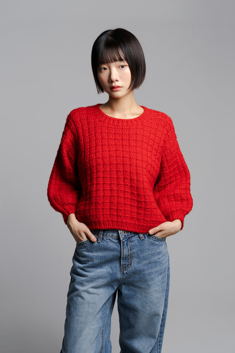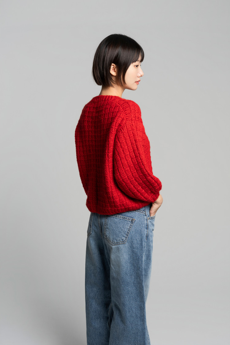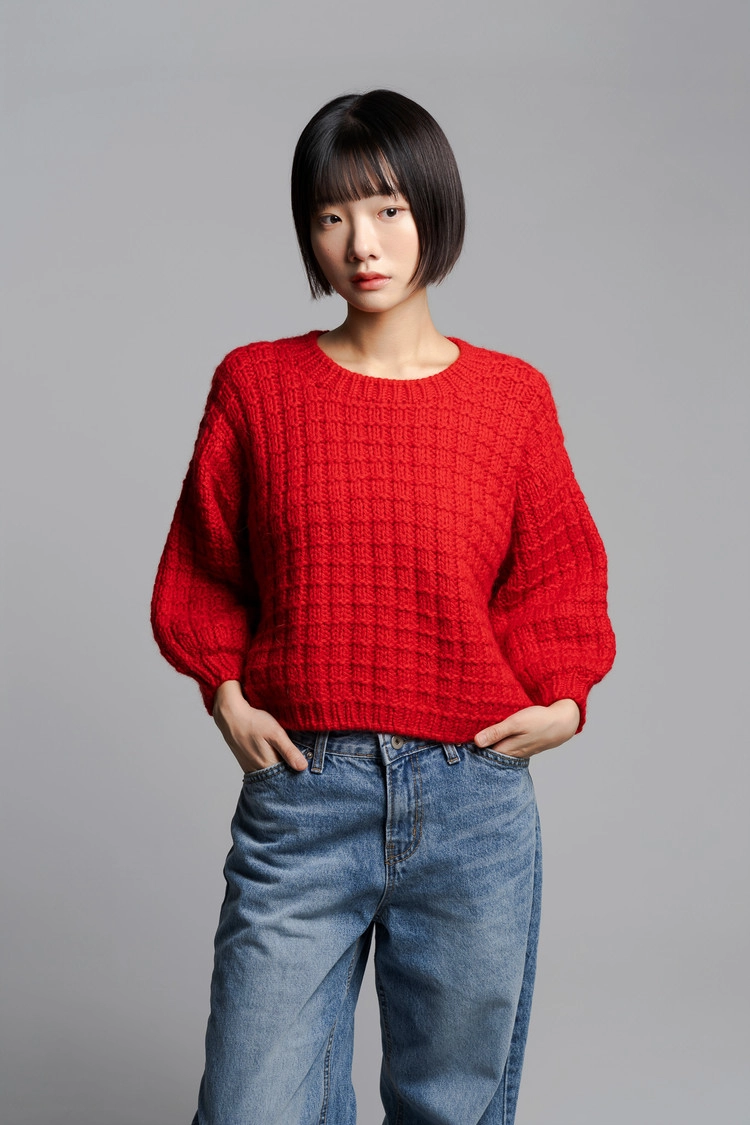 모눈이뇽 풀오버는 탑다운 드랍숄더 구조로, 자연스럽게 떨어지는 어깨선과 여유로운 실루엣이 특징입니다. 어깨에서부터 몸으로 이어지는 흐름이 부드럽고, 전체적으로 안정감 있는 핏을 만들어줍니다. “모눈” 이라는 이름처럼 겉뜨기와 안뜨기만으로 완성되는 네모무늬를 굵은 실과 바늘로 떠서 조금 더 귀엽고 포근한 볼륨감이 느껴지는 디자인이며, 특히 벌룬 소매로 마무리해 입체감과 귀여움을 더했습니다. 심플한 구조지만 뜰 때 손맛이 좋고, 짧은 시간 안에 완성할 수 있으면서도 완성도 높은 따뜻한 겨울 니트입니다.