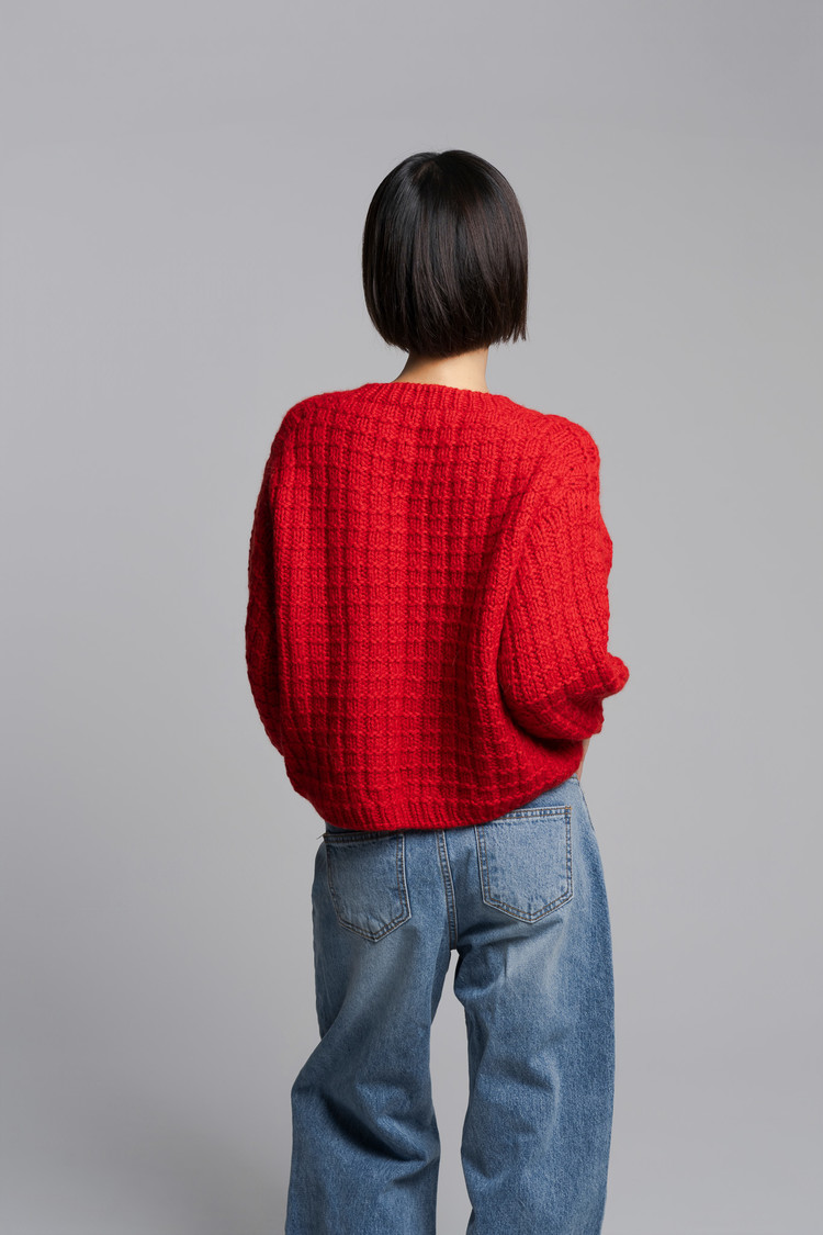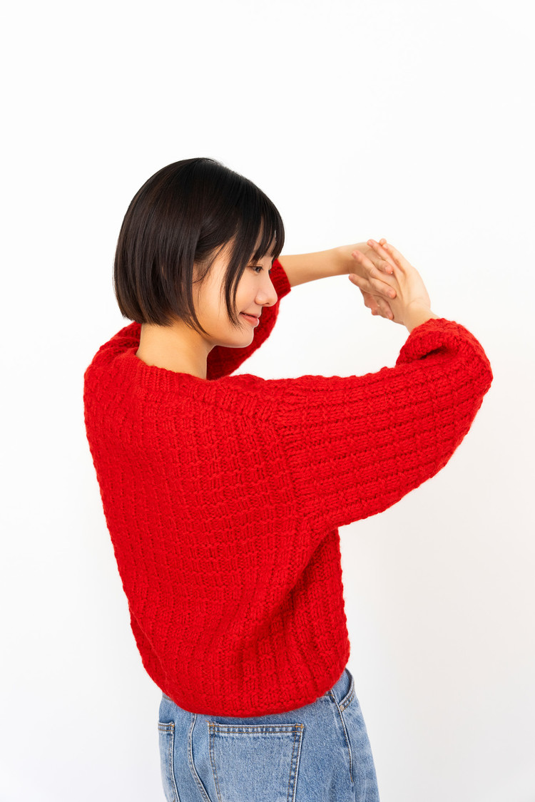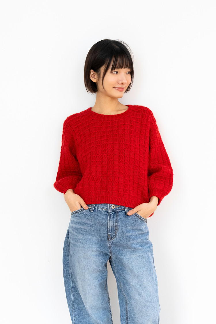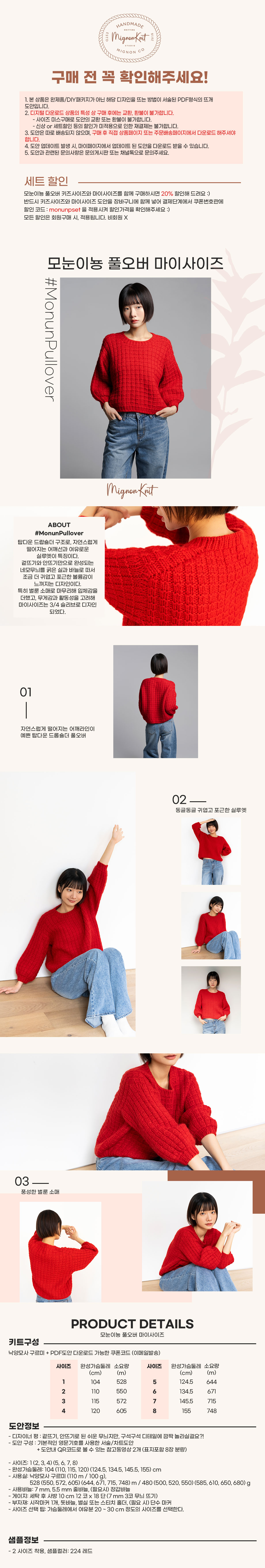 모눈이뇽 풀오버는 탑다운 드랍숄더 구조로, 자연스럽게 떨어지는 어깨선과 여유로운 실루엣이 특징입니다. 어깨에서부터 몸으로 이어지는 흐름이 부드럽고, 전체적으로 안정감 있는 핏을 만들어줍니다. “모눈” 이라는 이름처럼 겉뜨기와 안뜨기만으로 완성되는 네모무늬를 굵은 실과 바늘로 떠서 조금 더 귀엽고 포근한 볼륨감이 느껴지는 디자인이며, 특히 벌룬 소매로 마무리해 입체감과 귀여움을 더했습니다. 심플한 구조지만 뜰 때 손맛이 좋고, 짧은 시간 안에 완성할 수 있으면서도 완성도 높은 따뜻한 겨울 니트입니다.