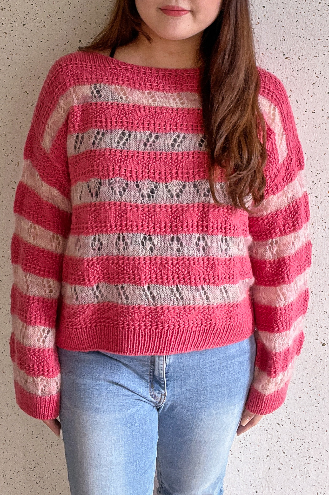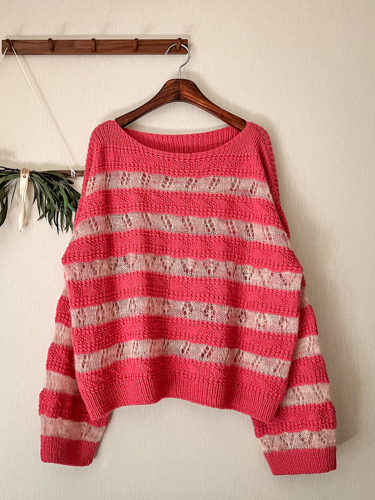 다양한 무늬의 텍스쳐를 느껴볼 수 있는구르미뇽은 탑다운 드랍숄더 형식으로. 뒷판과 앞판을 각각 네크라인에서 부터 떠내려와 언더암에서 원통으로 바디를 연결한 후 몸통을 떠내려 온 후, 소매코를 주워 소매를 떠주는 구조입니다. 소매없이 입는 베스트 옵션과 롱슬리브로 입을 수 있는 풀오버 옵션이 있어 취향껏 선택하여 뜰 수 있습니다.