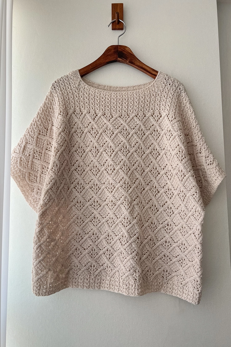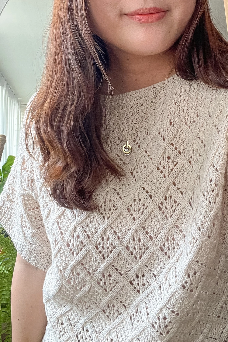애플파이뇽 탑은 바텀업 방식의 반팔 탑입니다. 원통뜨기로 몸통을 뜬 뒤 암홀 지점에서 앞뒤판을 분리하고 소매를 포함해 각각 떠 준 후 앞뒤판을 연결하는 방식으로 완성됩니다. 애플파이를 닮은 교차무늬와 레이스무늬의 조합으로 입체감을 살렸고, 여유있는 핏으로 편안하고 자연스럽게 착용할 수 있습니다.