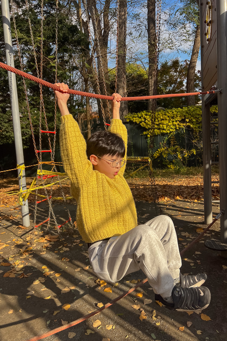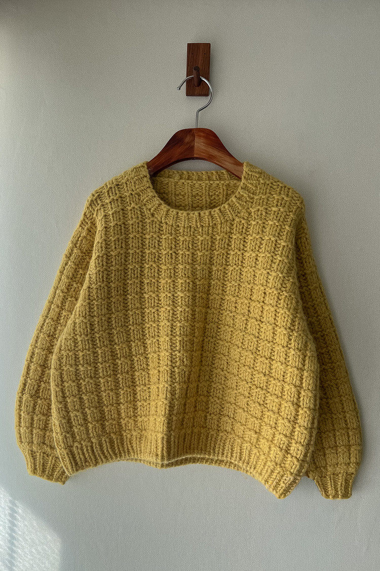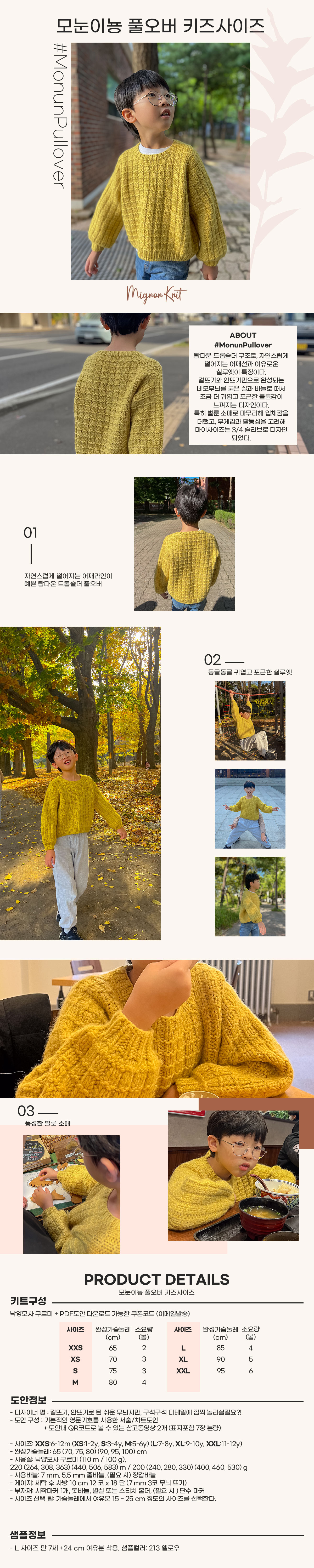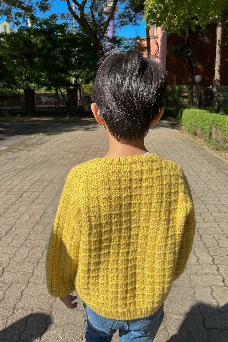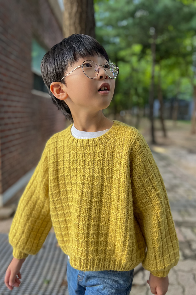 “모눈” 이라는 이름처럼 겉뜨기와 안뜨기만으로 완성되는 네모무늬를 굵은 실과 바늘로 떠서 조금 더 귀엽고 포근한 볼륨감이 느껴지는 디자인이입니다. 특히 벌룬 소매로 마무리해 입체감을 더했고, 무게감과 활동성을 고려해 마이사이즈는 3/4 슬리브로 디자인 되었습니다. 심플한 구조지만 뜰 때 손맛이 좋고, 짧은 시간 안에 완성할 수 있으면도 완성도 높은 따뜻한 겨울 니트입니다.